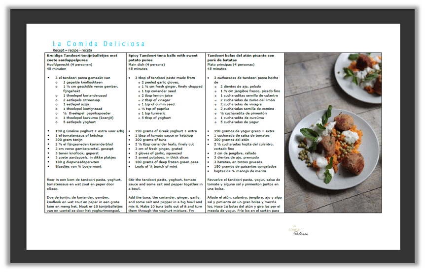 • recept Kruidige Tandoori tonijnballetjes met zoete aardappelpuree - recipe Spicy Tandoori tuna balls with sweet potato puree - receta Tandoori bolas del atún picante con puré de batatas