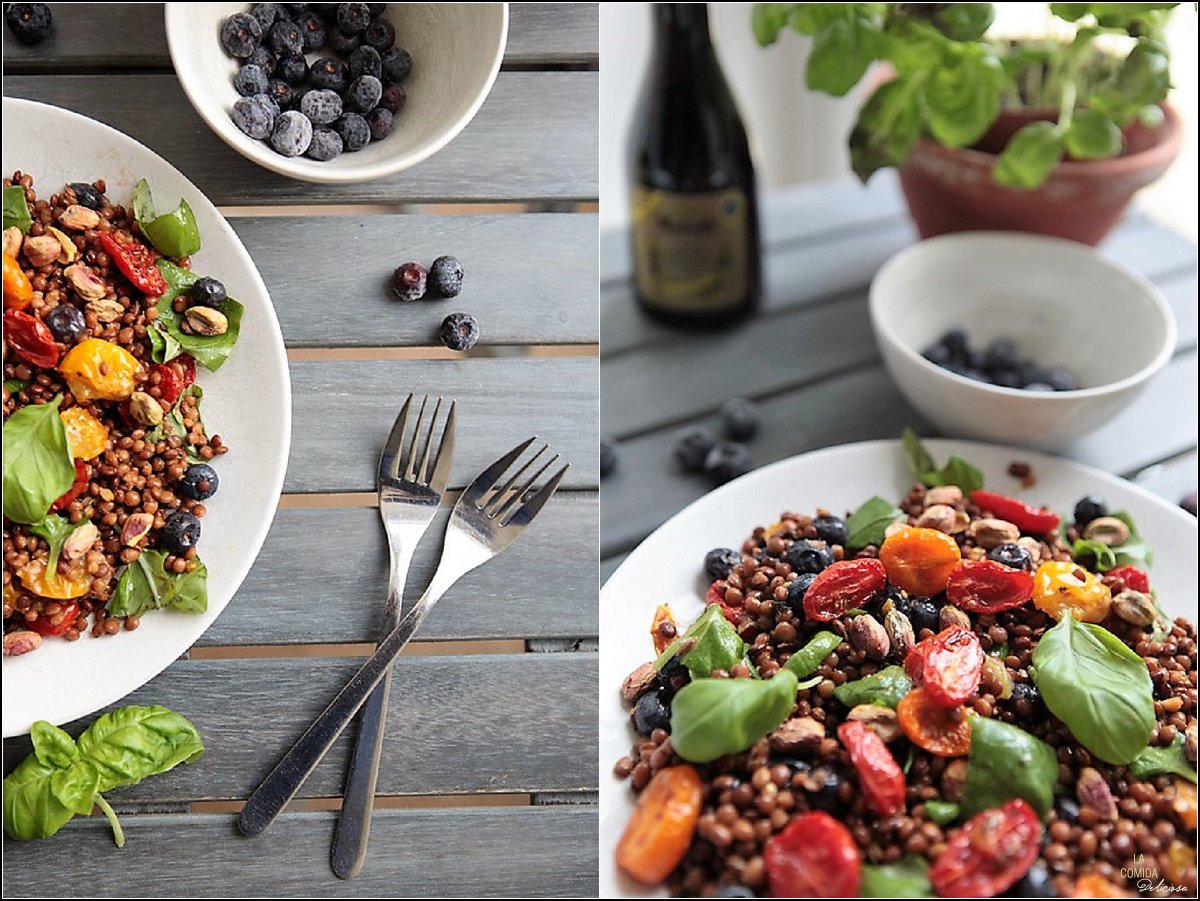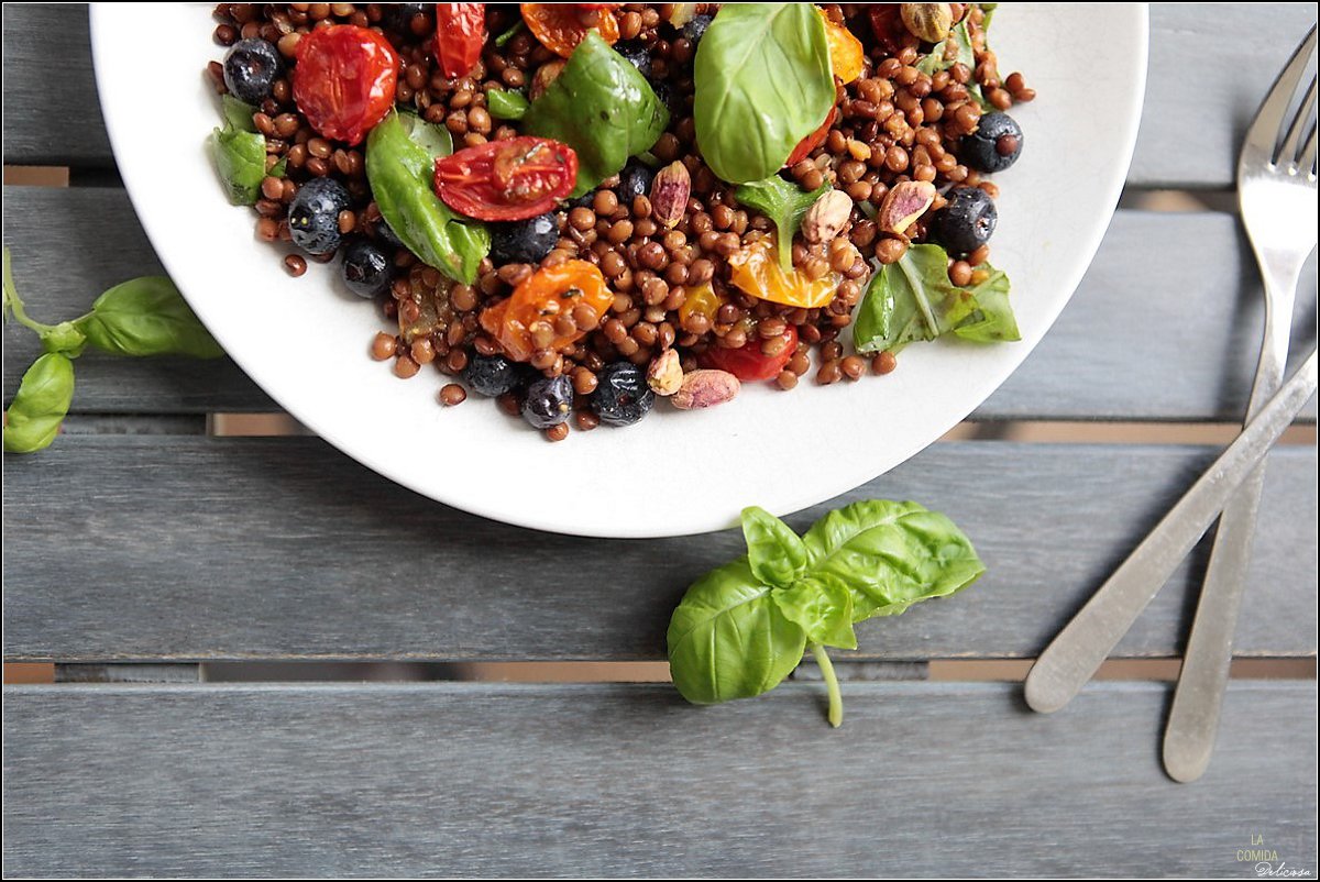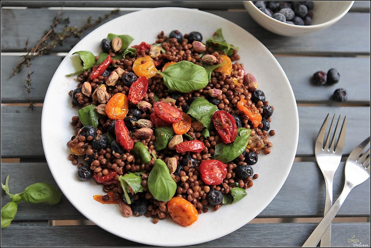 Esta semana no nueva compra y cocinar con lo que aún tienes en casa. Modestia parte que es pues sí mucho. Para despejar en mi despensa yo cojo una lata con lentejas y saca los arándanos del congelador. Ya he olvidado completamente que tengo tomates cherry. Sin hablar de tres paquetes de tomillo y dos macetes con albahaca.