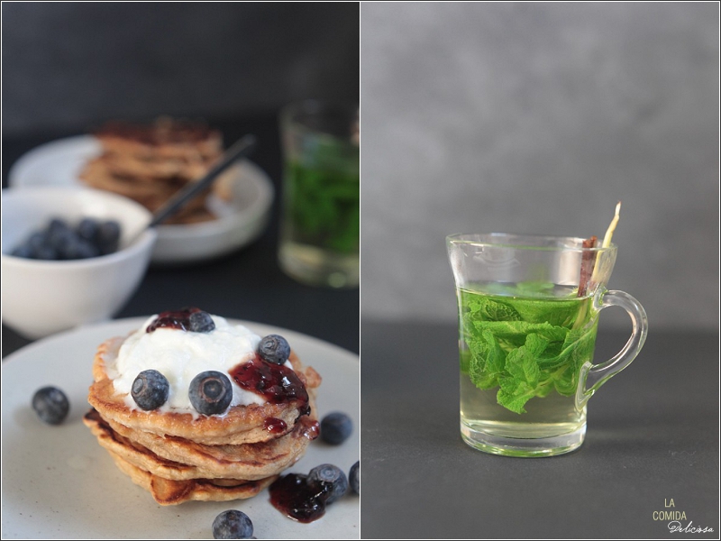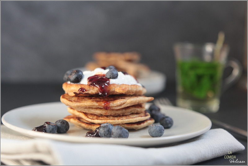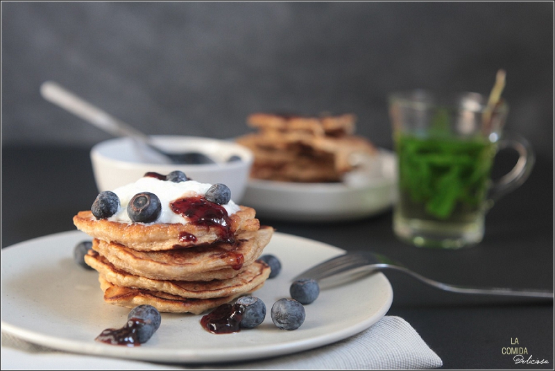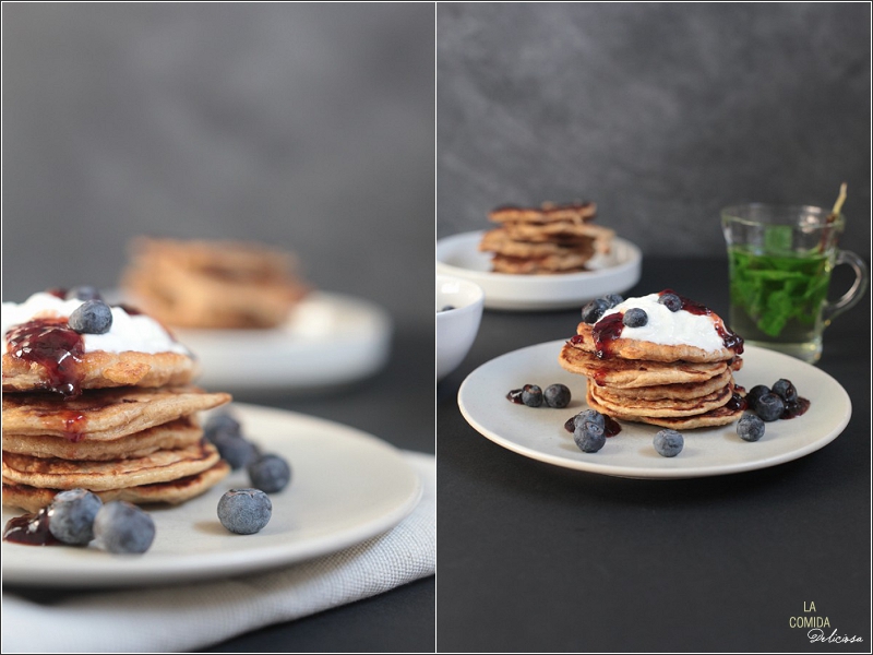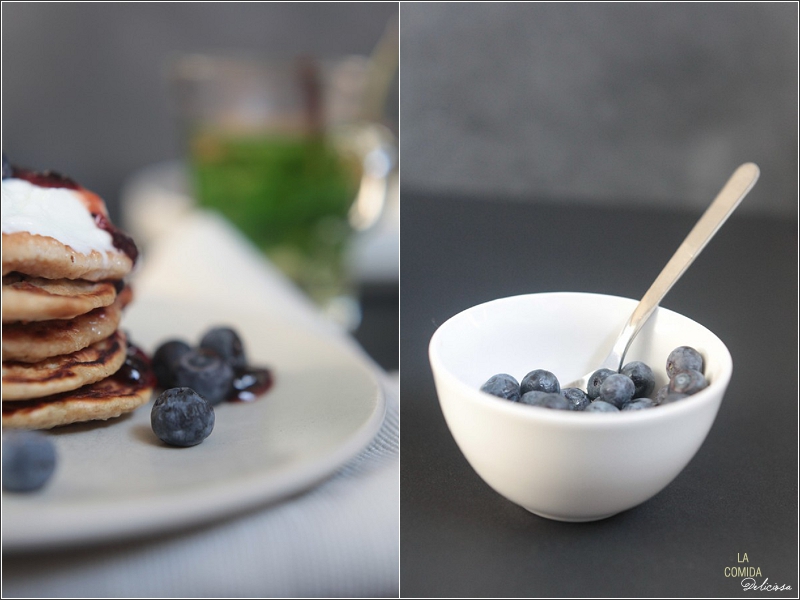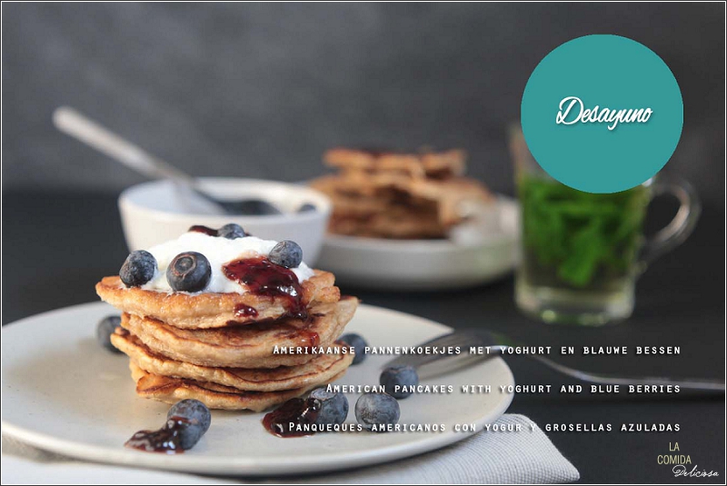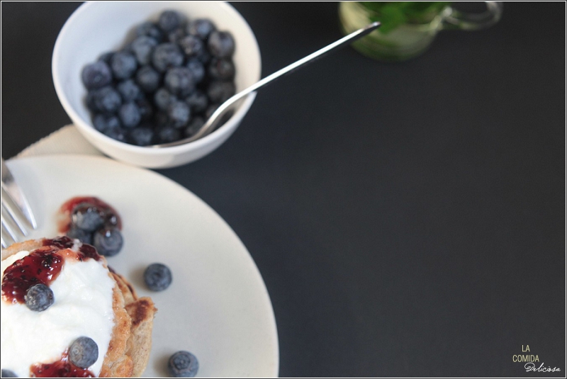 La preparación es simple. En el tiempo que estás cociendo los panqueques lavan las grosellas azuladas y aguas la mermelada. Toma un plato bonito, pila los panqueques y las decoran con el yogur, la mermelada y las grosellas. Procurar que haces bastante porque te las quedas comer y antes de que sabes est tu desayuno, tu desayuno que sirve del almuerzo o tu almuerzo. Disfruta de este día.