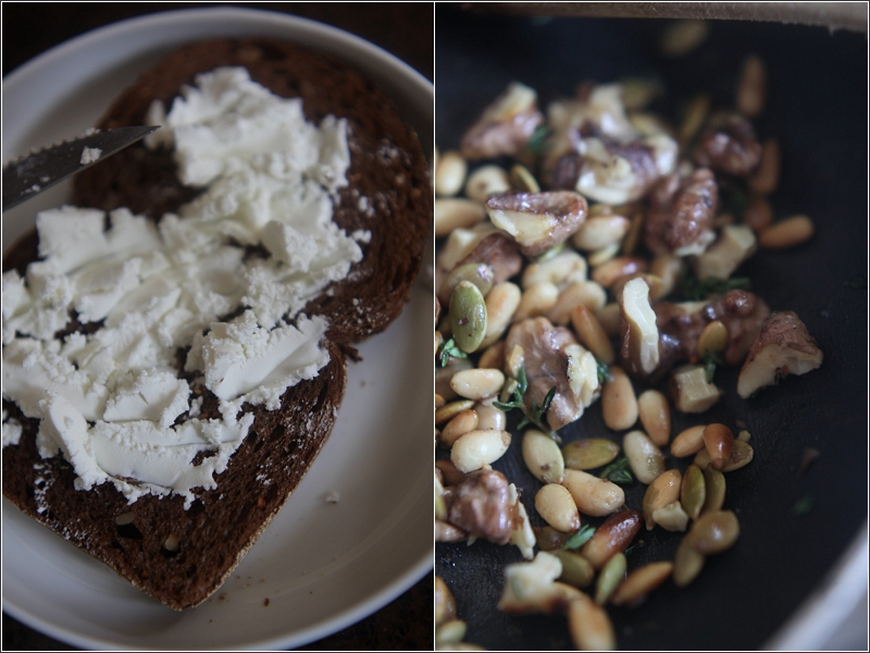 Een snelle lunch in nog geen vijf minuten. Roer walnoten, pijnboompitten en pompoenpitten in een beetje olijfolie door elkaar, voeg tijm er aan toe.
