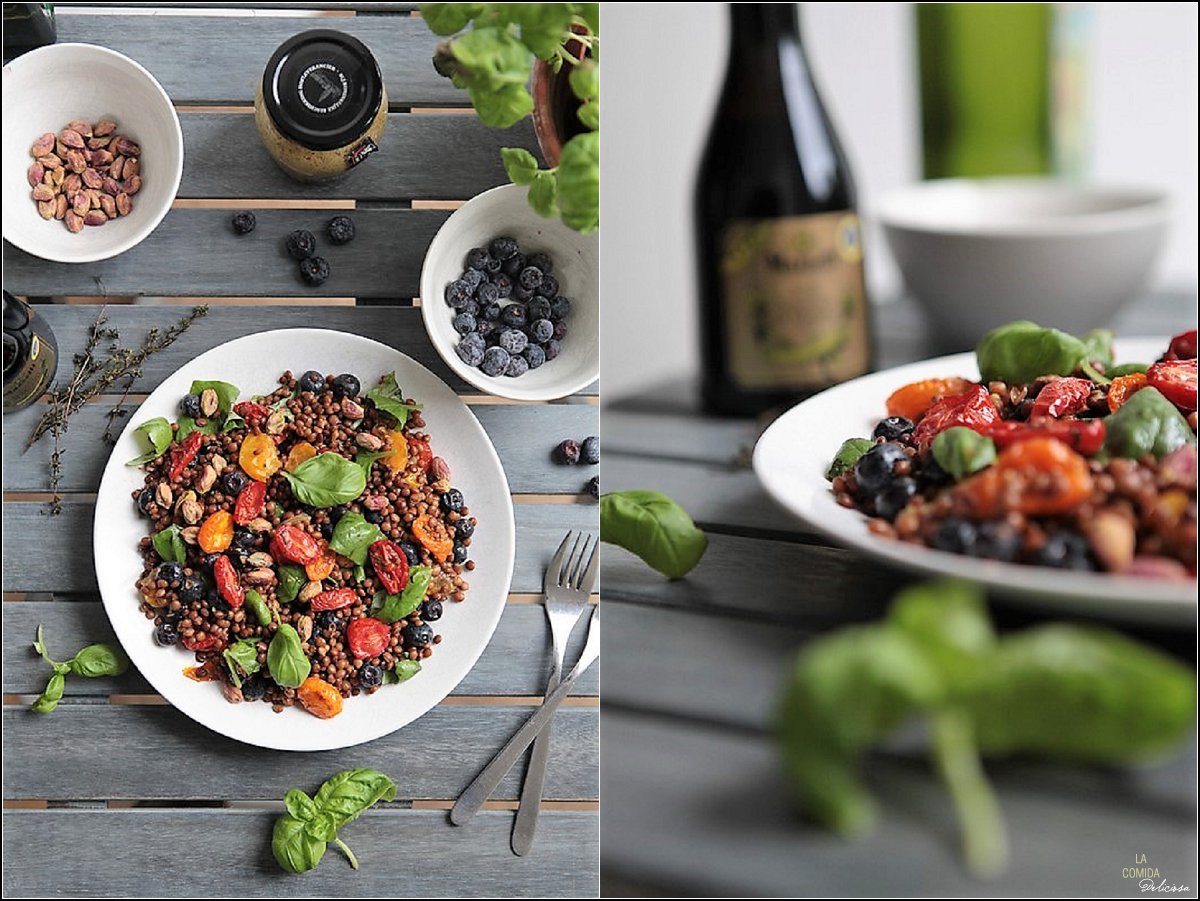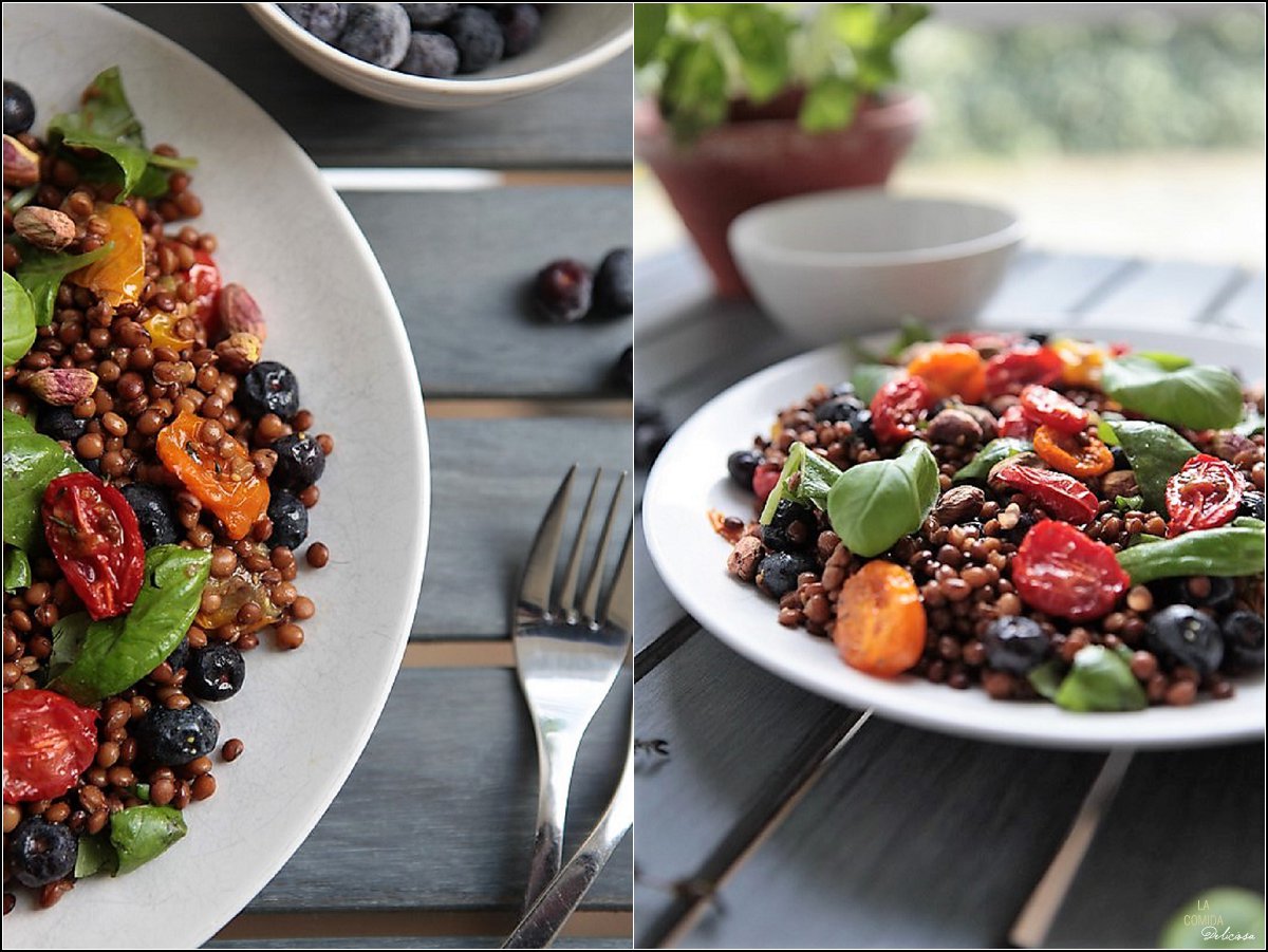 Esta semana no nueva compra y cocinar con lo que aún tienes en casa. Modestia parte que es pues sí mucho. Para despejar en mi despensa yo cojo una lata con lentejas y saca los arándanos del congelador. Ya he olvidado completamente que tengo tomates cherry. Sin hablar de tres paquetes de tomillo y dos macetes con albahaca.